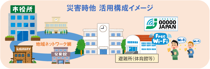 また、小中学校以外にも役所や役場を中心とした地域ネットワーク網として構築すれば、災害時以外にも行政情報やイベント情報、観光情報の提供等にも活用できます。