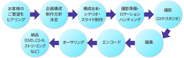 映像制作の専門スタッフがご要望のヒアリングから、企画、映像制作(撮影・編集)、視聴環境の提供まで、トータルな支援を行います。